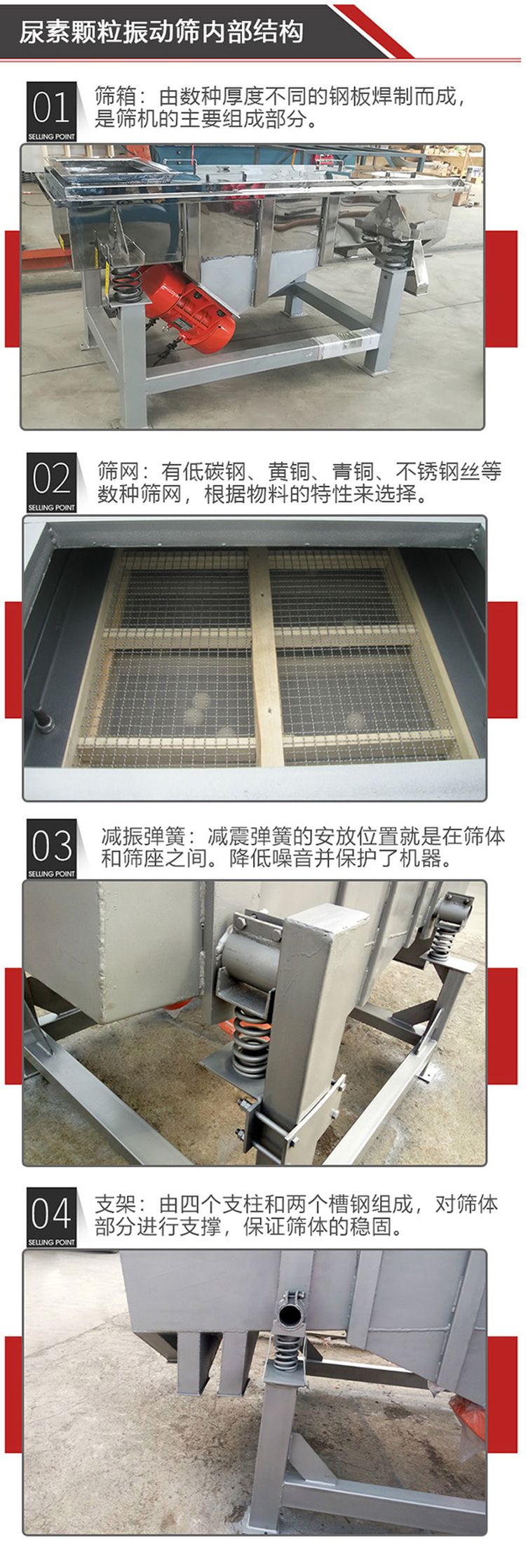 尿素顆粒振動(dòng)篩主要由篩箱、篩框、篩網(wǎng)、振動(dòng)電機(jī)、電機(jī)臺(tái)座、減振彈簧、支架等組成。