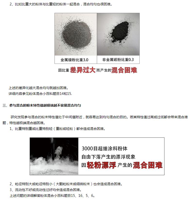 解決方法是混合之前要針對這樣的粉體做相應(yīng)的混前預(yù)處理。詳細內(nèi)容參見粉體混合小百科題目7.