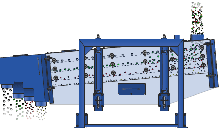 設(shè)備的篩箱在慣性力的作用下作前后往復(fù)運(yùn)動(dòng),并帶動(dòng)篩面做周期性搖動(dòng),迫使篩面上的物料隨篩箱一同做定向跳躍式運(yùn)動(dòng),小于篩面孔徑的物料通過篩框落到下層,稱為篩下物,大于篩面孔徑的物料經(jīng)連續(xù)翻滾跳躍運(yùn)動(dòng)后從排料口排出,完成篩分作業(yè)。