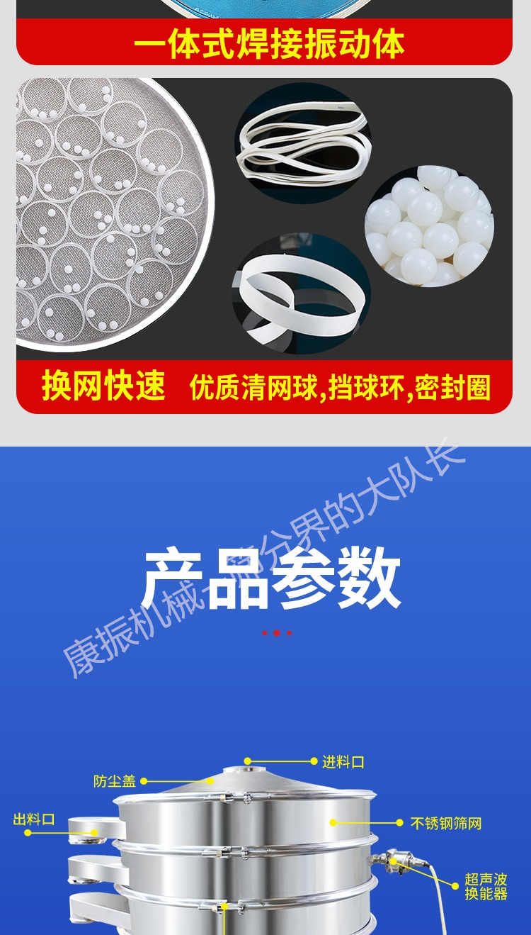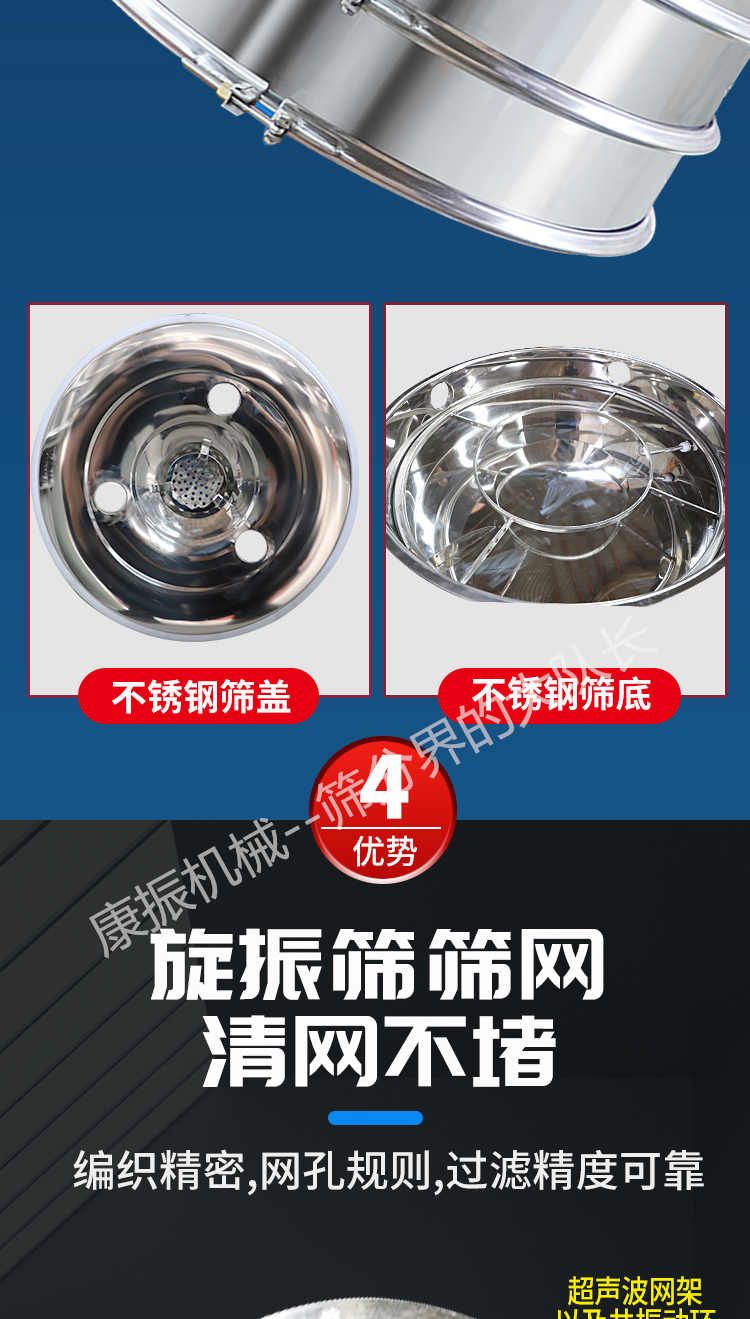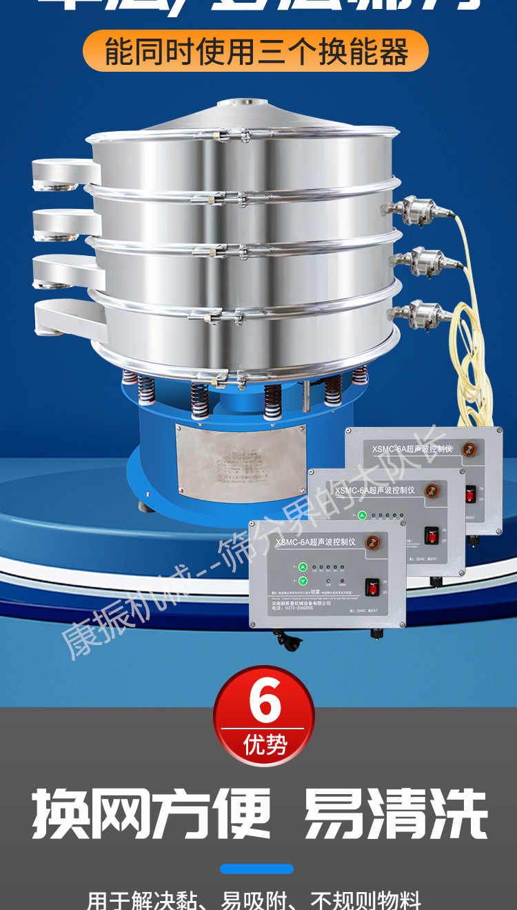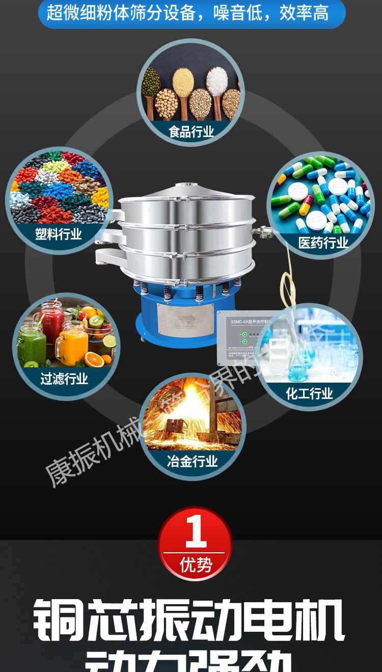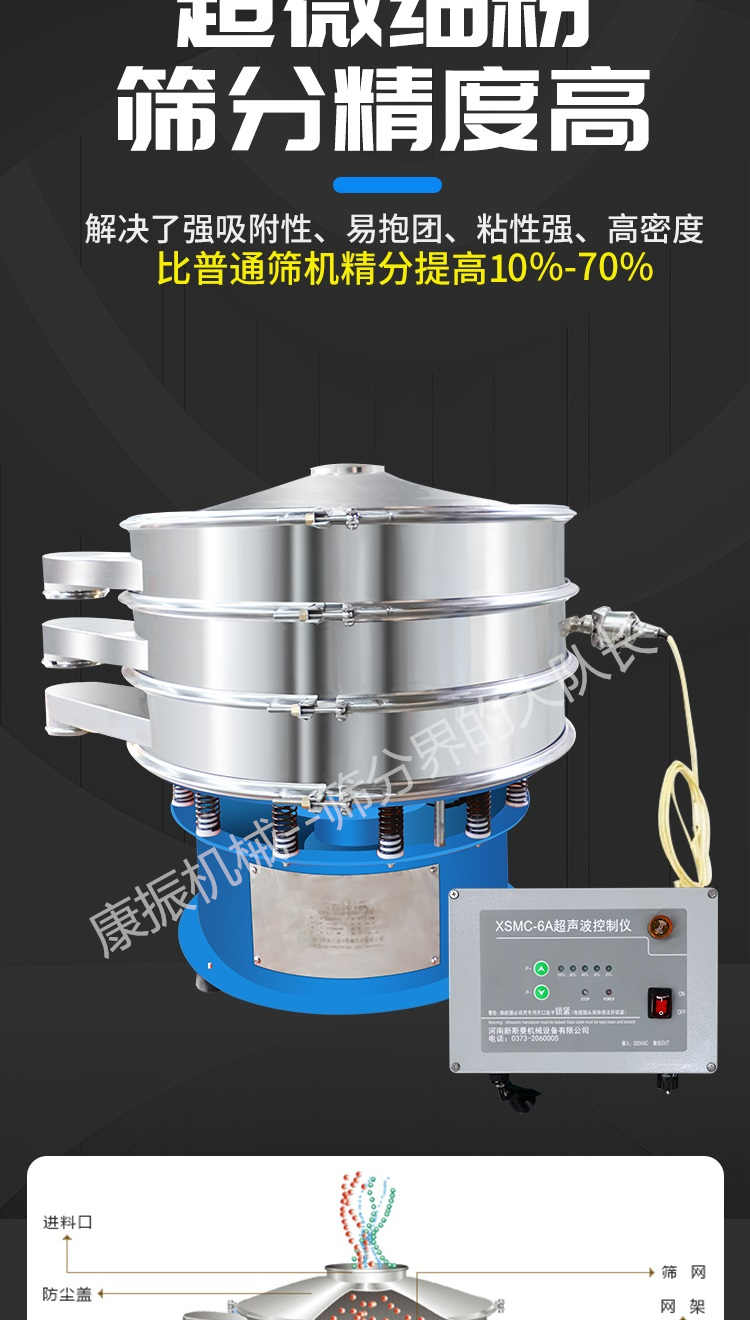 超聲波振動篩是在旋振篩的基礎(chǔ)上引入了超聲波清網(wǎng)裝置,通過將220V、50Hz或110V、60Hz電能轉(zhuǎn)化為18KHz的高頻電能,輸入超聲換能器,將其變成18KHz機械振動,從而達到高篩分和迅速清網(wǎng)的目的,使超微細粉篩分成為易事。該系統(tǒng)在傳統(tǒng)的振動篩基礎(chǔ)上在篩網(wǎng)上引入一個低振幅、高頻率的超聲振動波(機械波),以改善超微細粉體的篩分性能。特別適合高附加值精細粉體的用戶使用。超聲波篩分系統(tǒng)是一種簡單實用、可靠的篩分系統(tǒng),是當(dāng)前網(wǎng)孔堵塞的有效的解決方法??蓮V泛應(yīng)用于制藥、冶金、化工、選礦、食品等要求精細篩分過濾的行業(yè),篩分過濾精度高,有效解決因團聚、靜電、強吸附性卡堵網(wǎng)孔等篩分難題,是國內(nèi)篩分行業(yè)的一項重大技術(shù)突破。