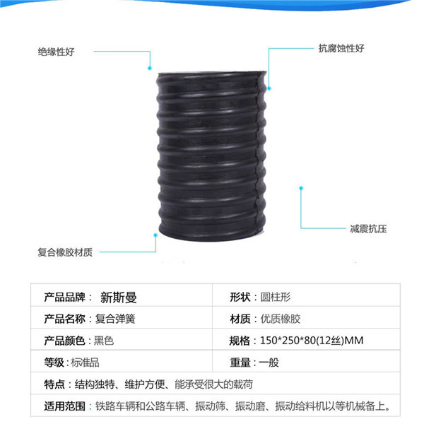 產品詳情product details復合彈簧:是由金屬螺旋彈簧和橡膠復合在一起的園筒狀彈性體。該產品優(yōu)于金屬彈簧,具有抗腐蝕性好、壽命長等優(yōu)點,與其它彈簧相比,減振能力強,緩沖效果好。