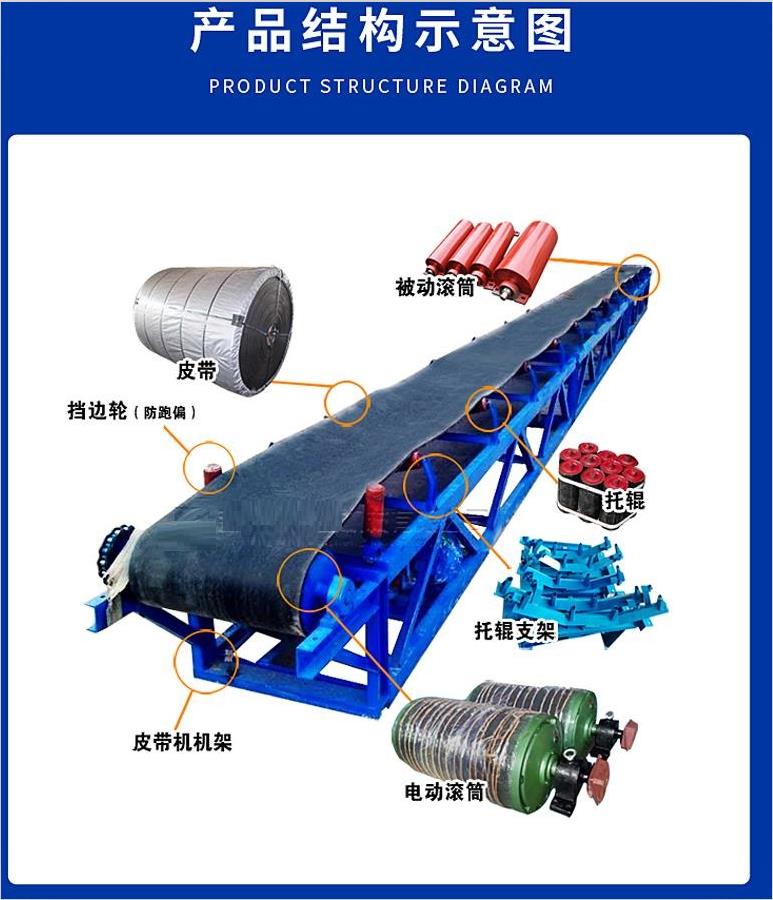 帶式輸送機(jī)結(jié)構(gòu)形式有: 水平直線輸送、提升爬坡輸送、轉(zhuǎn)彎輸送等多種形式,輸送帶上還可增設(shè)提升擋板、側(cè)擋板等附件,能滿足各種工藝要求。