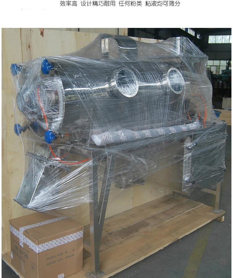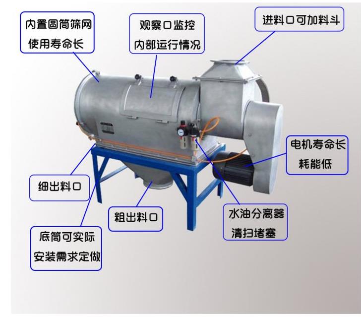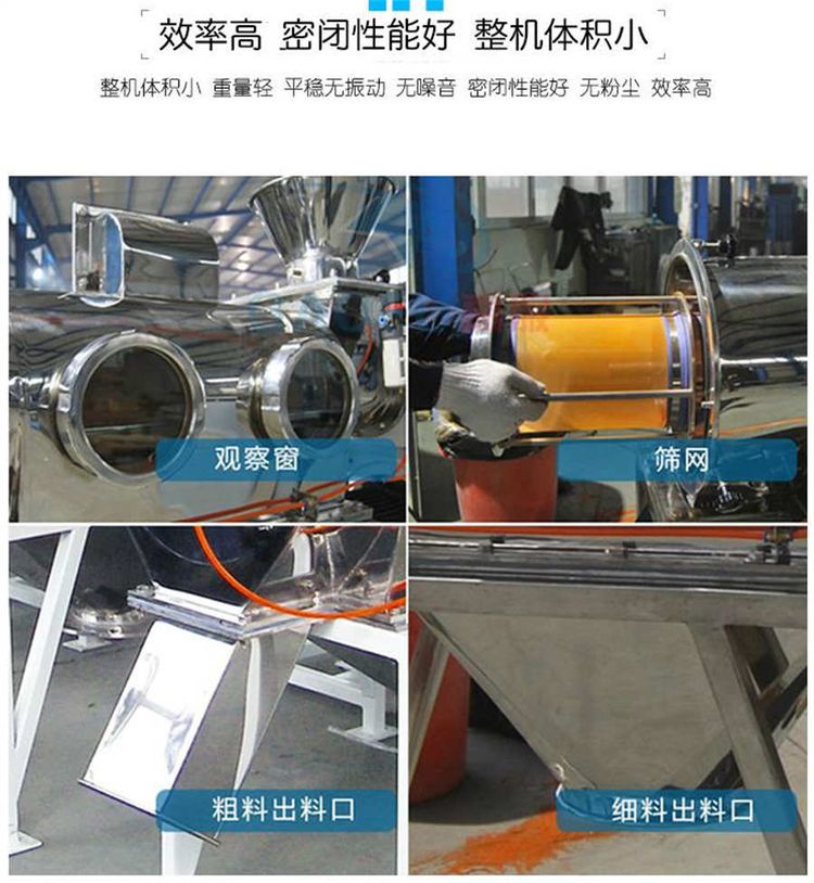 不能過(guò)網(wǎng)的物料沿筒壁從粗料排出口排出,達(dá)到快速分離的目的。