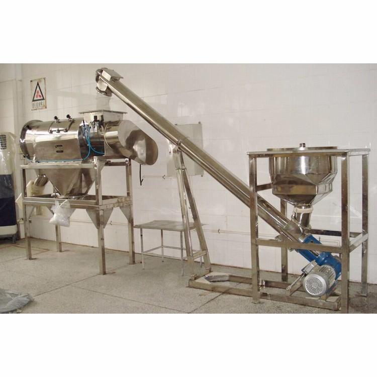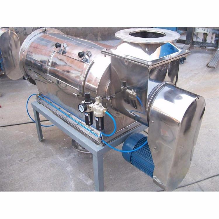 臥式氣流篩篩網(wǎng)為圓筒狀,置于機(jī)體內(nèi),物料通過(guò)螺旋輸送系統(tǒng)后,和氣流混合、霧化進(jìn)入網(wǎng)筒內(nèi);