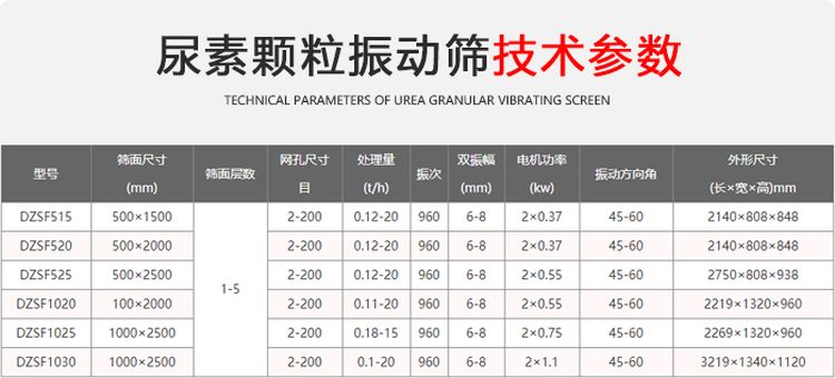 尿素顆粒振動(dòng)篩有:DZSF-515、DZSF-520、DZSF-1020、DZSF-1025、DZSF-1030、DZSF-1035、DZSF-1540等長、寬、高不同的機(jī)型。