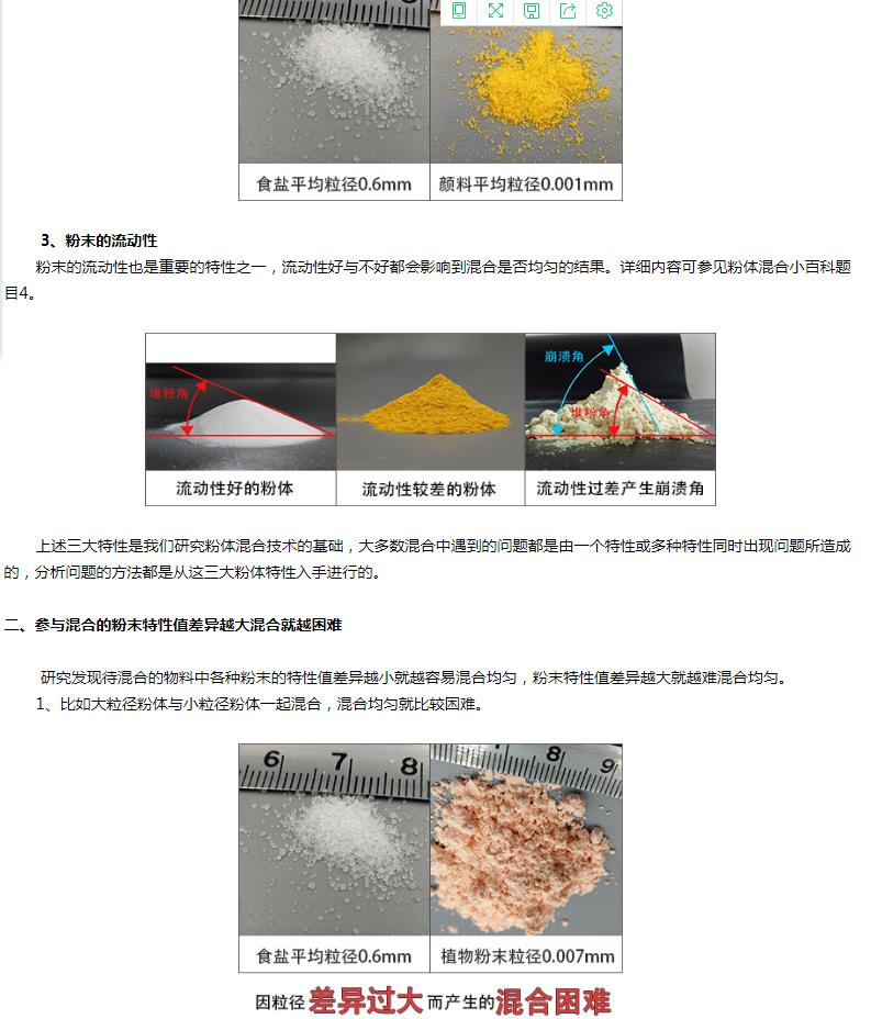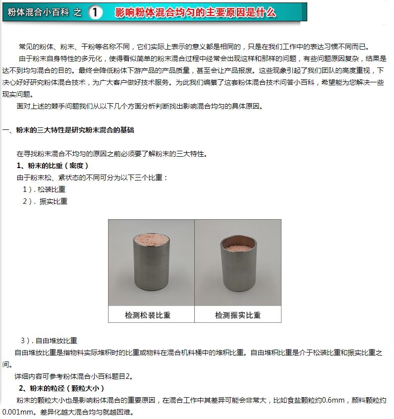 解決方法是混合之前要針對這樣的粉體做相應(yīng)的混前預(yù)處理。詳細內(nèi)容參見粉體混合小百科題目7.