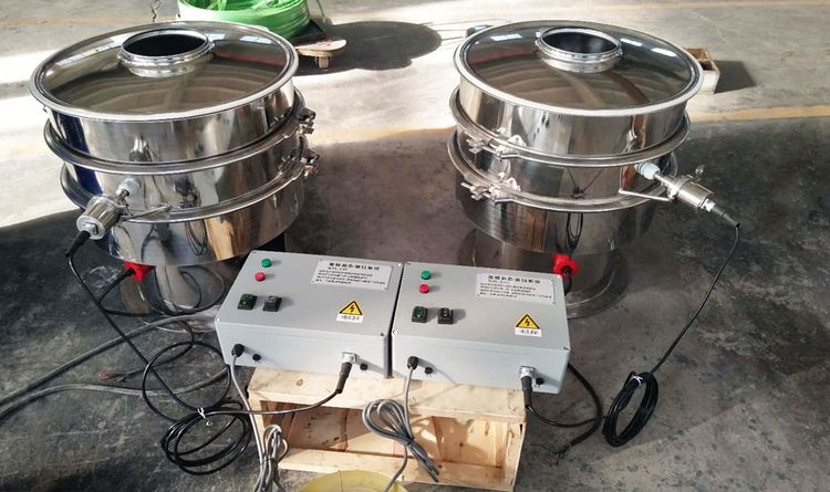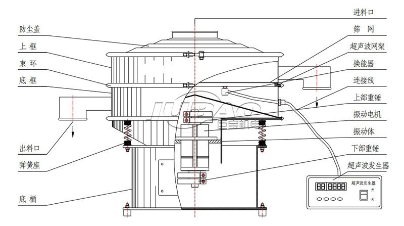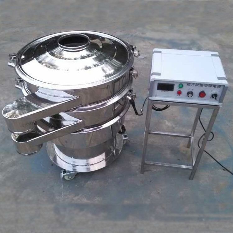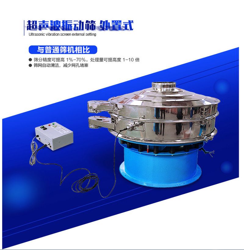 超聲波振動篩是將220V、50Hz或110V、60Hz電能轉(zhuǎn)化為36KHz的高頻電能,輸入超聲換能器,將其變成36KHz機(jī)械振動,產(chǎn)生的功率超聲波使篩網(wǎng)作高頻振動。篩網(wǎng)上的物料在作低頻旋振運(yùn)動的同時,疊加上超聲振動,既可防止網(wǎng)孔堵塞,又可使篩分機(jī)提高產(chǎn)量和質(zhì)量,從而達(dá)到快速篩分和清網(wǎng)的目的,使超微細(xì)粉篩分成為易事。該系統(tǒng)在傳統(tǒng)的振動篩基礎(chǔ)上在篩網(wǎng)上引入一個低振幅、高頻率的超聲振動波(機(jī)械波),以改變超微細(xì)分體的篩分性能。特別適合高附加值精細(xì)分體的用戶使用。