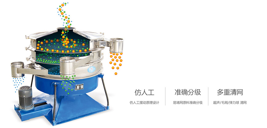 搖擺篩是一種仿人工搖動的低頻旋振篩,其原理是:瞬時運動為沿徑向的位移和以此位移為軸的圓周運動的合成(螺旋運動),即可調(diào)節(jié)偏心距的激振器產(chǎn)生了非線性三維運動,物料也產(chǎn)生同樣的近似手動作業(yè)的運動,從而達到篩分之目的,再配合篩分附件可獲得更加理想的篩分效果,適合于圓形狀、圓柱狀、片狀、乃至 于規(guī)則形狀易堵網(wǎng)且需要精細篩分的物料,是為了滿足大產(chǎn)量、高密度篩分用戶而設計的一種篩分設備,與一般圓形篩相比,它的篩分精度、效率、產(chǎn)量、篩網(wǎng)壽命能提高5-10倍,符合所有精細與超細范圍的粉末與微粒狀物料,特別適合難以處理的物料。還可單層或多層篩分,一次可篩分至6個粒度。搖擺篩適合精細和超細范圍的粉末和微粒狀物料,產(chǎn)量大、精度高