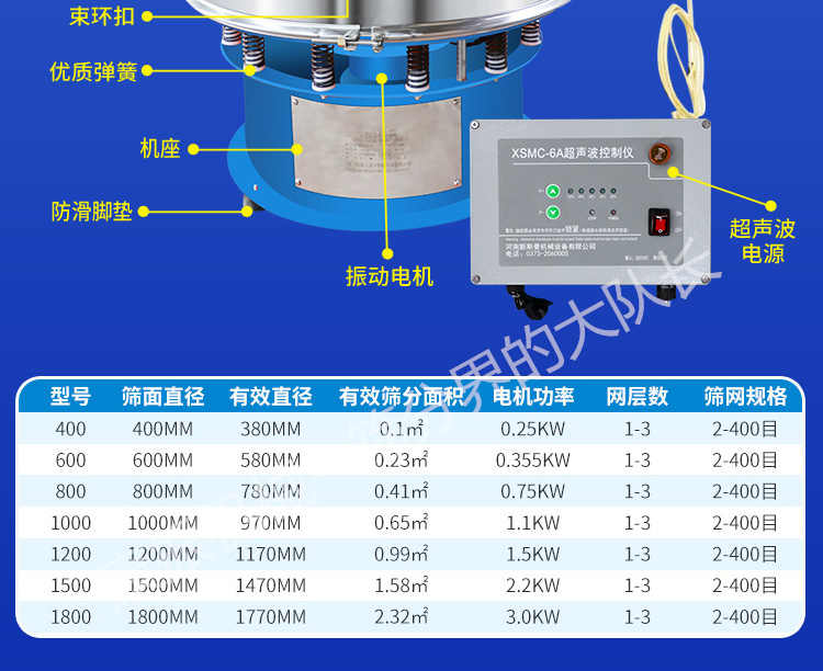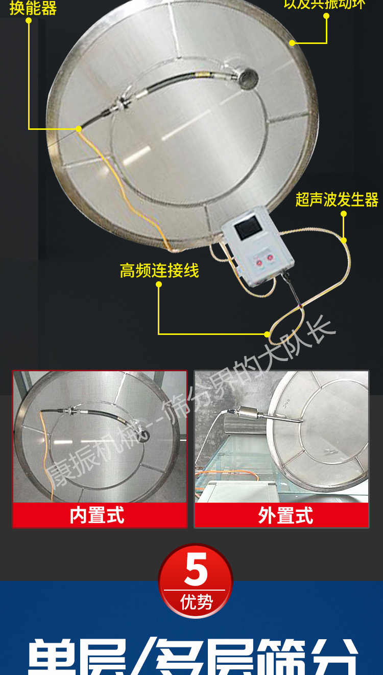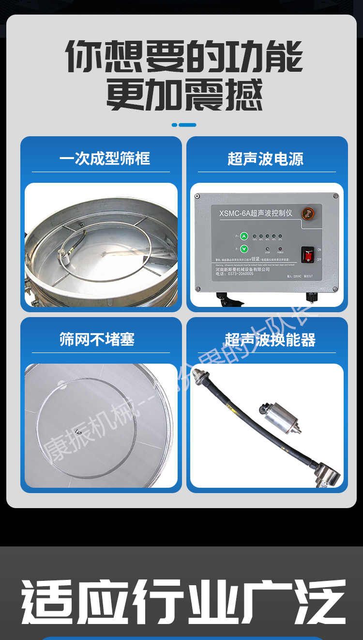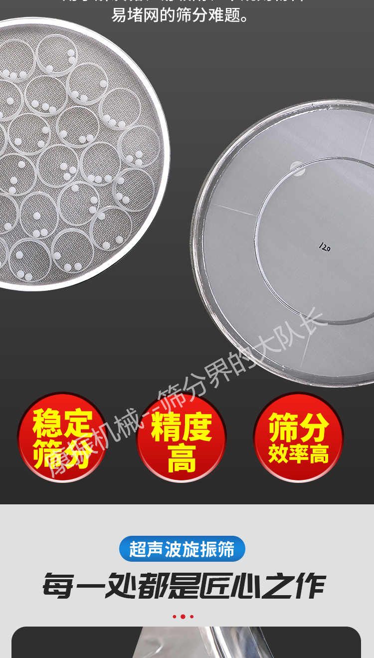 超聲波振動篩是在旋振篩的基礎(chǔ)上引入了超聲波清網(wǎng)裝置,通過將220V、50Hz或110V、60Hz電能轉(zhuǎn)化為18KHz的高頻電能,輸入超聲換能器,將其變成18KHz機械振動,從而達到高篩分和迅速清網(wǎng)的目的,使超微細粉篩分成為易事。該系統(tǒng)在傳統(tǒng)的振動篩基礎(chǔ)上在篩網(wǎng)上引入一個低振幅、高頻率的超聲振動波(機械波),以改善超微細粉體的篩分性能。特別適合高附加值精細粉體的用戶使用。超聲波篩分系統(tǒng)是一種簡單實用、可靠的篩分系統(tǒng),是當(dāng)前網(wǎng)孔堵塞的有效的解決方法??蓮V泛應(yīng)用于制藥、冶金、化工、選礦、食品等要求精細篩分過濾的行業(yè),篩分過濾精度高,有效解決因團聚、靜電、強吸附性卡堵網(wǎng)孔等篩分難題,是國內(nèi)篩分行業(yè)的一項重大技術(shù)突破。