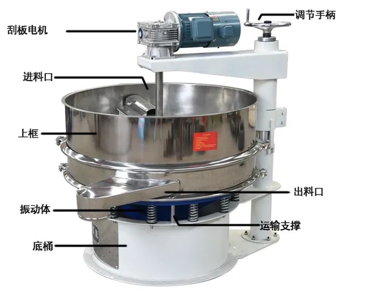 便于加強(qiáng)振動(dòng)篩篩網(wǎng)的自清潔功能,例 如在面粉篩分中,有些細(xì)渣子易于掉落在網(wǎng)孔中,在刮板旋轉(zhuǎn)推動(dòng)的作用下,