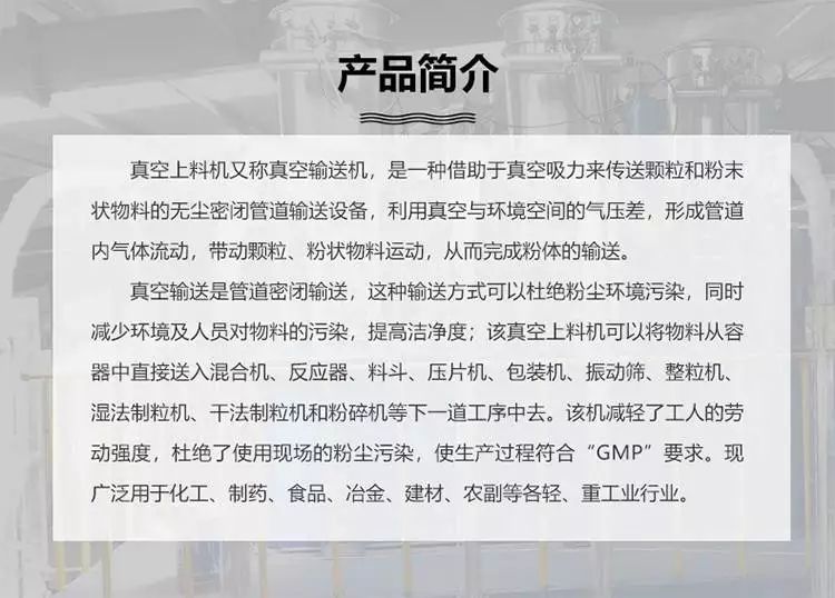 ZKS系列真空上料又稱真空輸送機(jī),是通過氣體產(chǎn)生真空輸送粉體料的設(shè)備,是氣體輸送的一種。適用于醫(yī)藥、食品、化工、冶金、建材等多個(gè)行業(yè),針對(duì)各種粉體物料的密閉輸送,提高物料的潔凈度,能滿足不同客戶的多種輸送需要。
