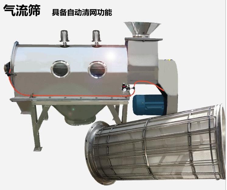 臥式氣流篩篩網(wǎng)為圓筒狀,置于機(jī)體內(nèi),物料通過(guò)螺旋輸送系統(tǒng)后,和氣流混合、霧化進(jìn)入網(wǎng)筒內(nèi);