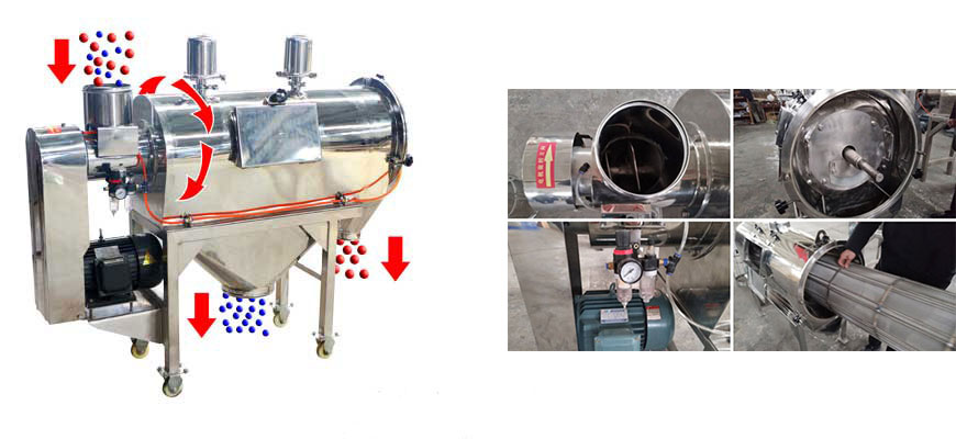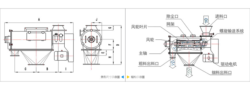 不能過(guò)網(wǎng)的物料沿筒壁從粗料排出口排出,達(dá)到快速分離的目的。